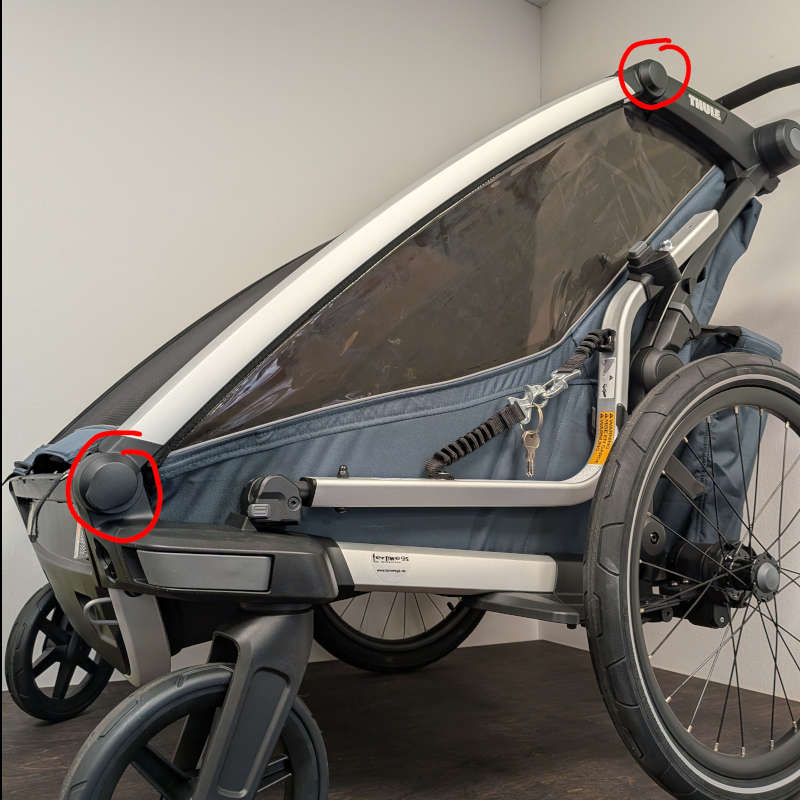 Den Thule Kindertransporter und das Zubehör regelmäßig auf Schäden und Abnutzungserscheinungen untersuchen. Alle Metallbauteile auf Brüche oder Risse prüfen. Den Kindertransporter nicht verwenden, wenn Metallbauteile Risse aufweisen oder beschädigt sind. Den Kindertransporter auf verbogene, defekte, fehlende oder gelockerte Befestigungselemente überprüfen. Gelockerte Befestigungselemente anziehen und beschädigte oder fehlende Teile ersetzen.
